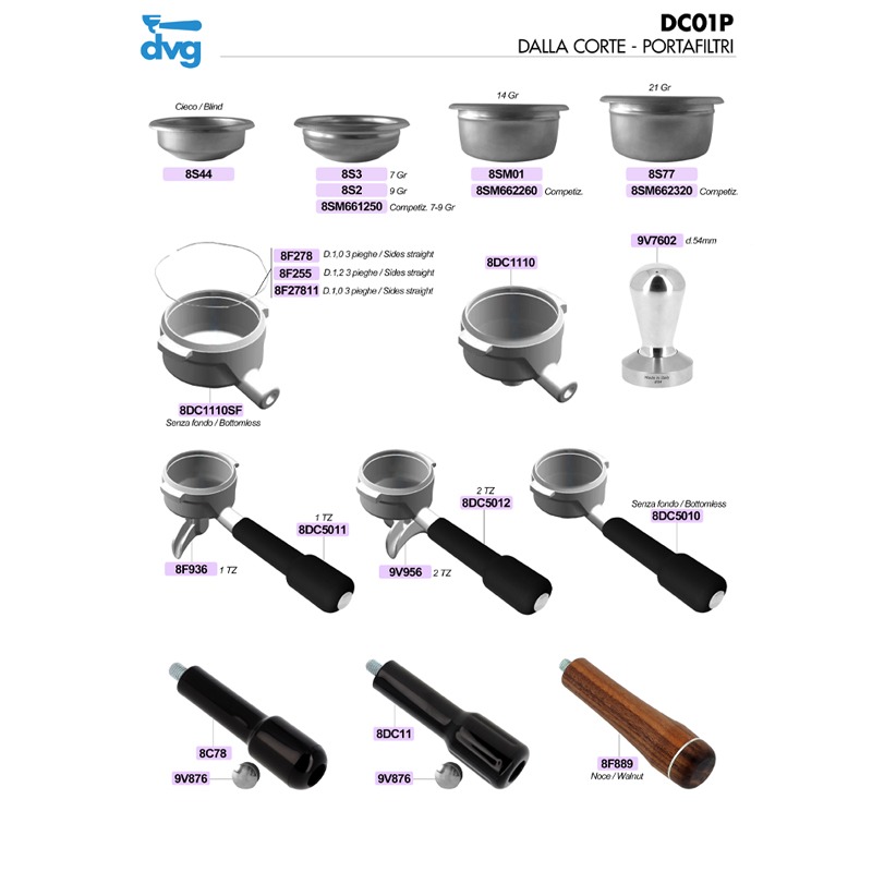 Edge D.66mm, Body D.56mm suitable to tamper D.54mm, height 26mm, external ridge 57mm. Perfored area d.44mm, holes d. 0,30mm, high-quality conical drilling, electropolished filter that keeps the surface more shiny, smoother, more stainless. It fits: Dalla Corte, Izzo, La San Marco.