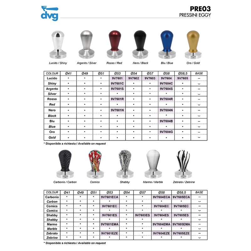 9V7604G EGGY COFFEE TAMPER, GOLD ANODIZED HANDLE WITH S. STEEL FLAT BASE D.58MM Made in ItalyErgonomic handle, customizable with laser-engraved logo. Go back Request info Warning! To make an order by using our Web Site and to check out our items, You need to get an account. Login Sign up