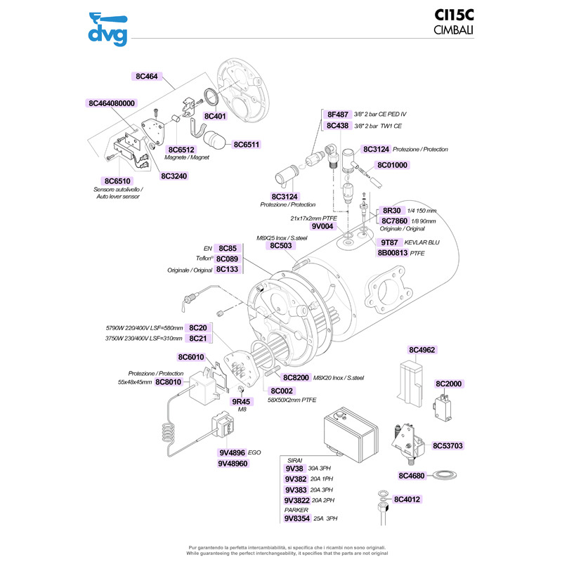 Cimbali (mod. M100, M20, M21 Junior, M24, M28, M29, M30, M31 Bistro, M32 Bistro, M34, M39, M39-GT, M39-TE) Faema (mod. E61, E61 Legend, E64, E66, E98 Compact, Enova, Nostop, P4, P6, Star), Fiamma First (mod. Prestige), Isomac (mod. Millenium, Mondiale, Tea, Zaffiro), Orchestrale (mod. Etnica, Phonica), La Pavoni (mod. Bar, Bart, Giotto Evo Pid, Giotto Guru, P tre, P uno, Pub) Sanremo (mod. Milano LX, Torino, Treviso, Treviso LX, Verona, Verona 2/3gr, Verona RS), Wega (mod. Airy, Antares, Atlas, Colosseum, Combinova, Espressa, Euro 2000, Formula Milano, Io, Junior, Mininova, Nova, Novecento, Orion Eco, Polaris, Sphera, Start, Syntesis, Vela) coffee machines